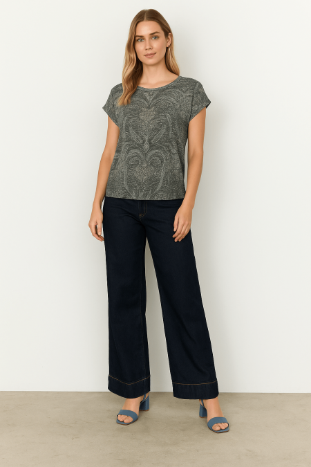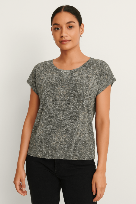 $72.00is a comfortable T-shirt composed of 52% Viscose, 44% Polyester, 4% Elastane. This top features a rounded neckline, short sleeves, and an abstract floral print. Pair with your favorite bottoms, for an easy everyday look. – 52% Viscose, 44% Polyester, 4% Elastane- 30°C Mild wash, Do not bleach, Do not…
